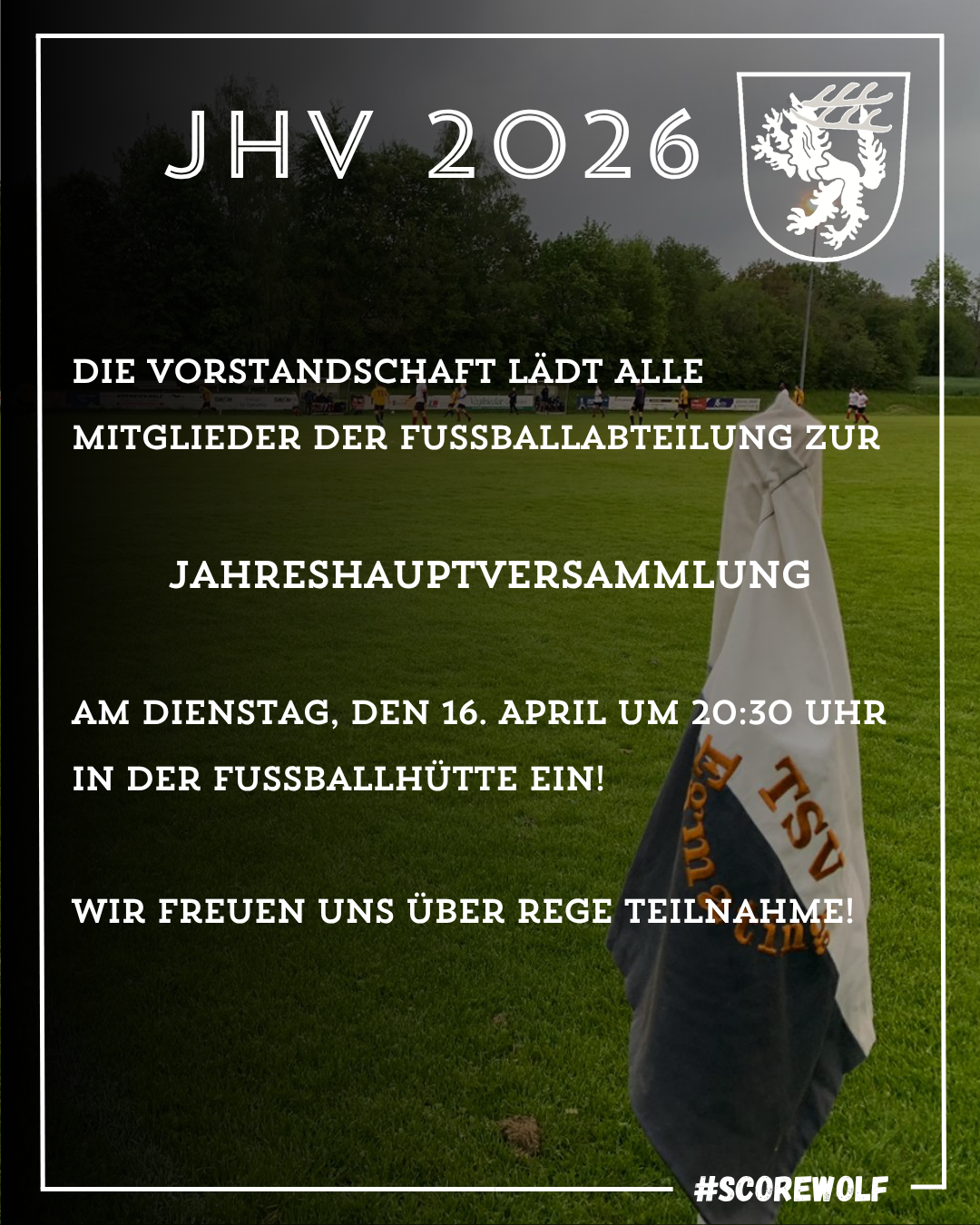 Die Vorstandschaft lädt alle Mitglieder der Fußballabteilung zur Jahreshauptversammlung am Dienstag, den 16. April 2026 um 20:30 Uhr in der Fußballhütte ein! Wir freuen uns über rege Teilnahme! Die Einladung findet ihr HIER.